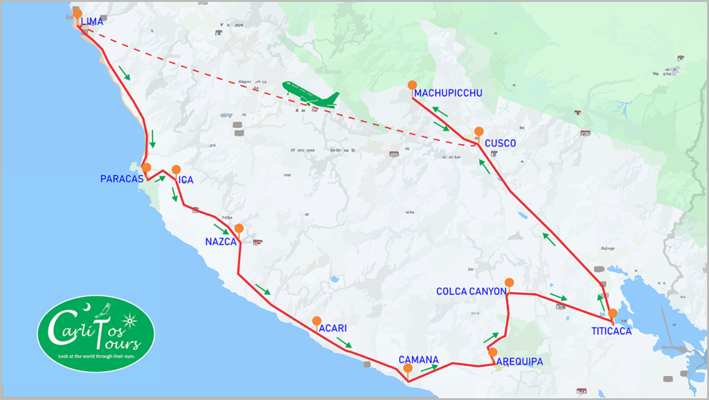 We take our transport and We go for almost two hours to Nasca. Arriving Nasca We take a fly over nasca lines and We visit the acueducts in Nasca, Once finish the tour in Nasca, we take our transport for 9 hours more to Arequipa Along the way, we stop in